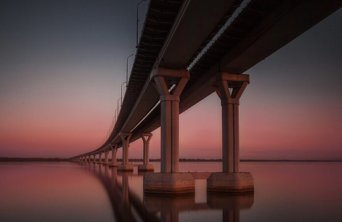 Фотограф поделился эффектным снимком саратовского моста через Волгу на рассвете