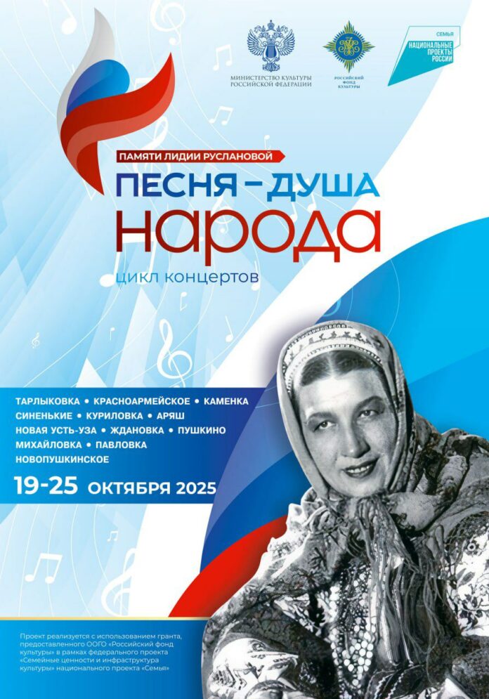 С 19 октября в регионе стартует цикл музыкальных мероприятий «Песня — душа народа», посвященный творчеству легендарной певицы Лидии Руслановой. Проект проводится уже в пятый раз и в этом году охватит 12 сельских населенных пунктов.