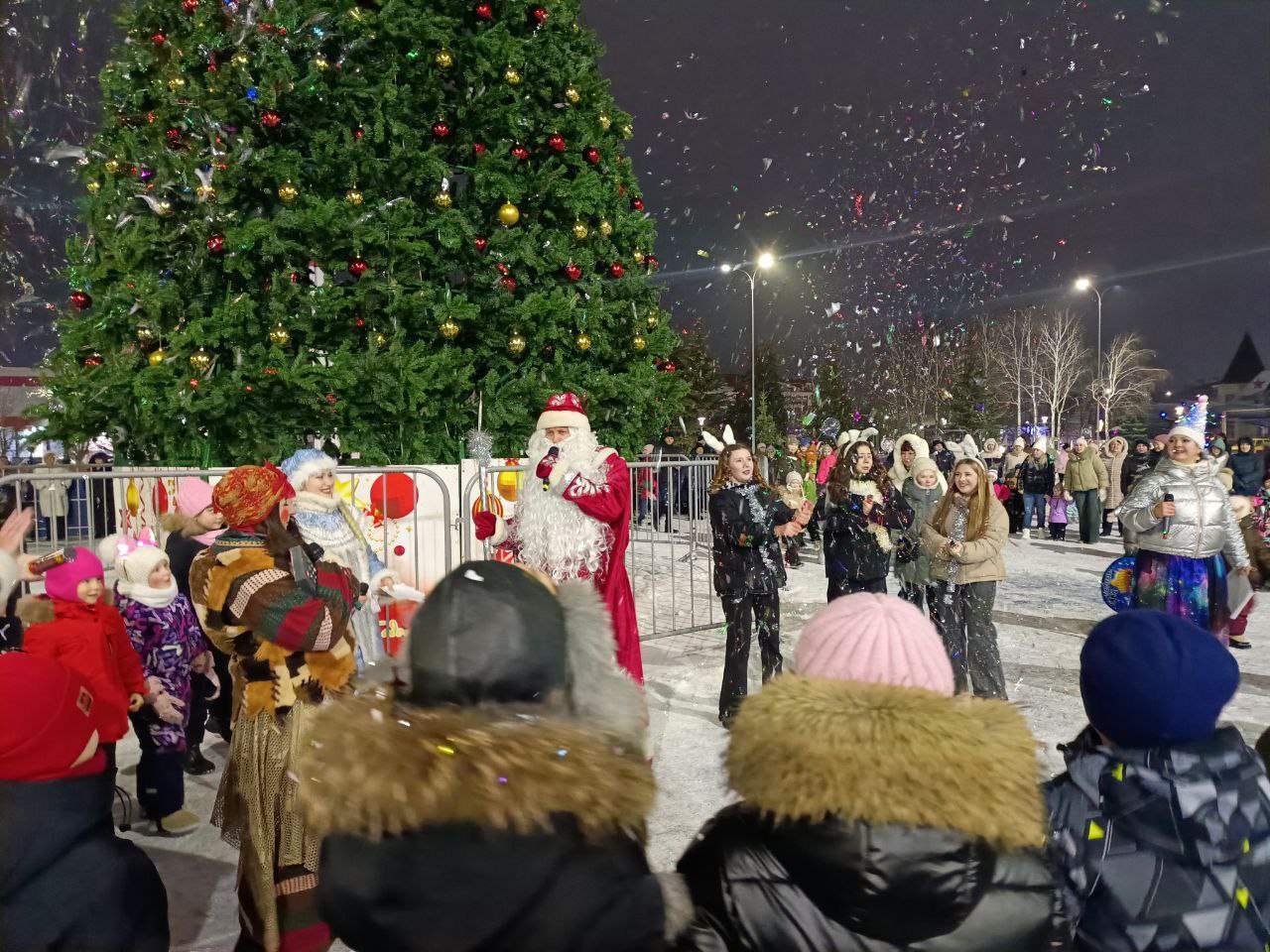 Праздник длился два часа. Были и конкурсы, и танцевальные номера, и яркие конфетти, и хороводы вокруг ёлки, и снежная горка. И конечно, долгожданная встреча с Дедом Морозом и Снегурочкой.