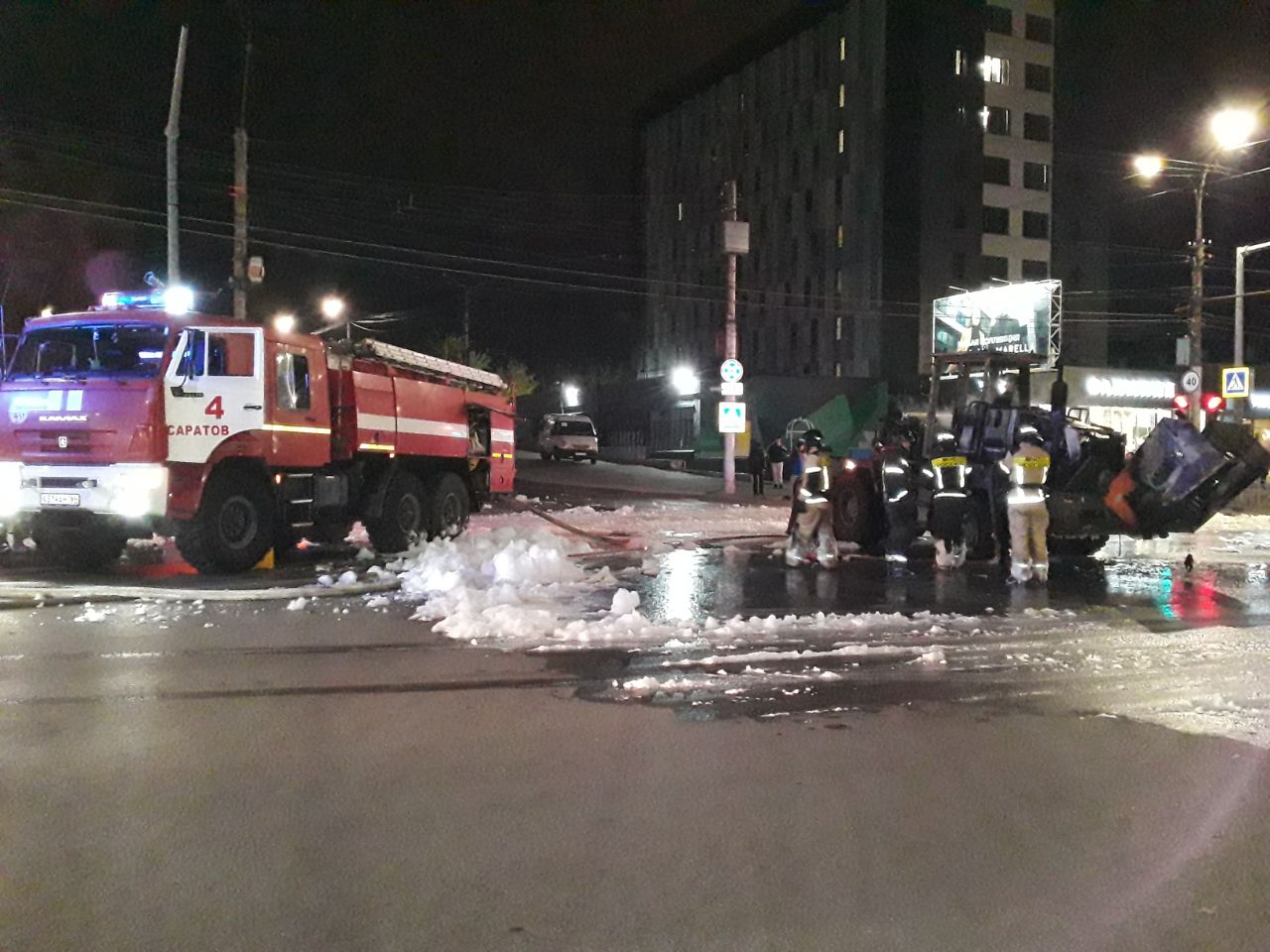 Причины инцидента неизвестны. На месте работают пожарные и «скорая». Перекрёсток залит пожарной пеной, движение машин по нему затруднено.