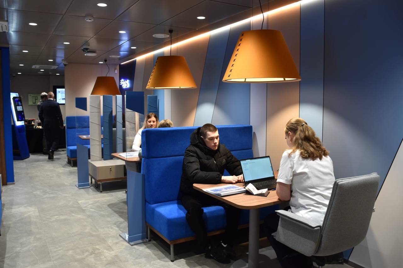 Традиционные стойки заменили на зоны с мягкой мебелью для консультаций. Посетителям доступны кофе-станция и бесплатный Wi-Fi. Особое внимание уделили круглосуточному самообслуживанию: в отдельной зоне установили современные банкоматы с функцией операций по QR-коду. Это позволяет быстро пополнять счета, оплачивать услуги и делать переводы прямо со смартфона.