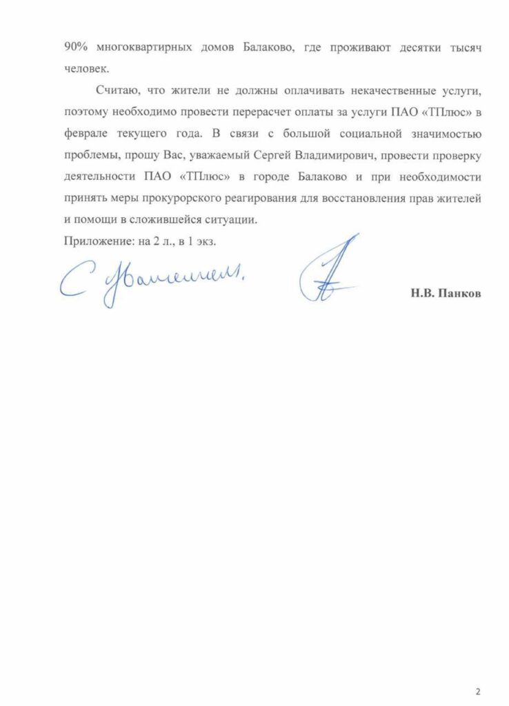 «Как и обещал, направил адресный список в прокуратуру с просьбой провести проверку деятельности ПАО «Т Плюс» и помочь восстановить права граждан. Считаю, жители не должны платить за некачественные услуги», — рассказал депутат.