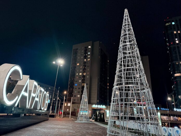 На Славянской площади в Саратове 3 декабря начали монтировать главные новогодние ели. Высота праздничных конструкций составляет восемь метров, а их основа изготовлена из прочного алюминиевого каркаса.