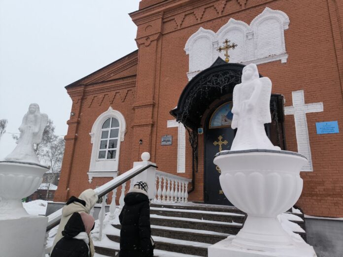 Вход в Покровский храм в Петровске Саратовской области украсили снежные скульптуры.