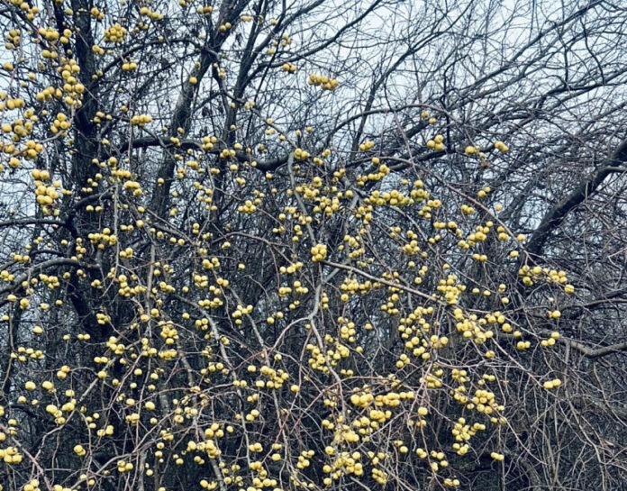 Дерево, расположенное в заказнике «Саратовский» Федоровского района, стоит с голыми ветвями, на которых крепко держатся ярко-желтые яблоки. Как отметили в пресс-службе парка, сочные плоды создают эффектный контраст с осенним пейзажем, напоминая «последний штрих цвета перед наступлением зимы».
