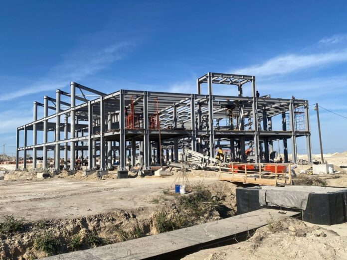 На строительной площадке задействовано более 200 специалистов и 50 единиц техники. В настоящее время ведутся работы по устройству фундаментов, монтажу металлоконструкций, прокладке инженерных коммуникаций и возведению стен ключевых объектов. Уже полностью завершены фундаменты для бокса досмотра транспорта, питомника для служебных собак и служебно-производственного здания.