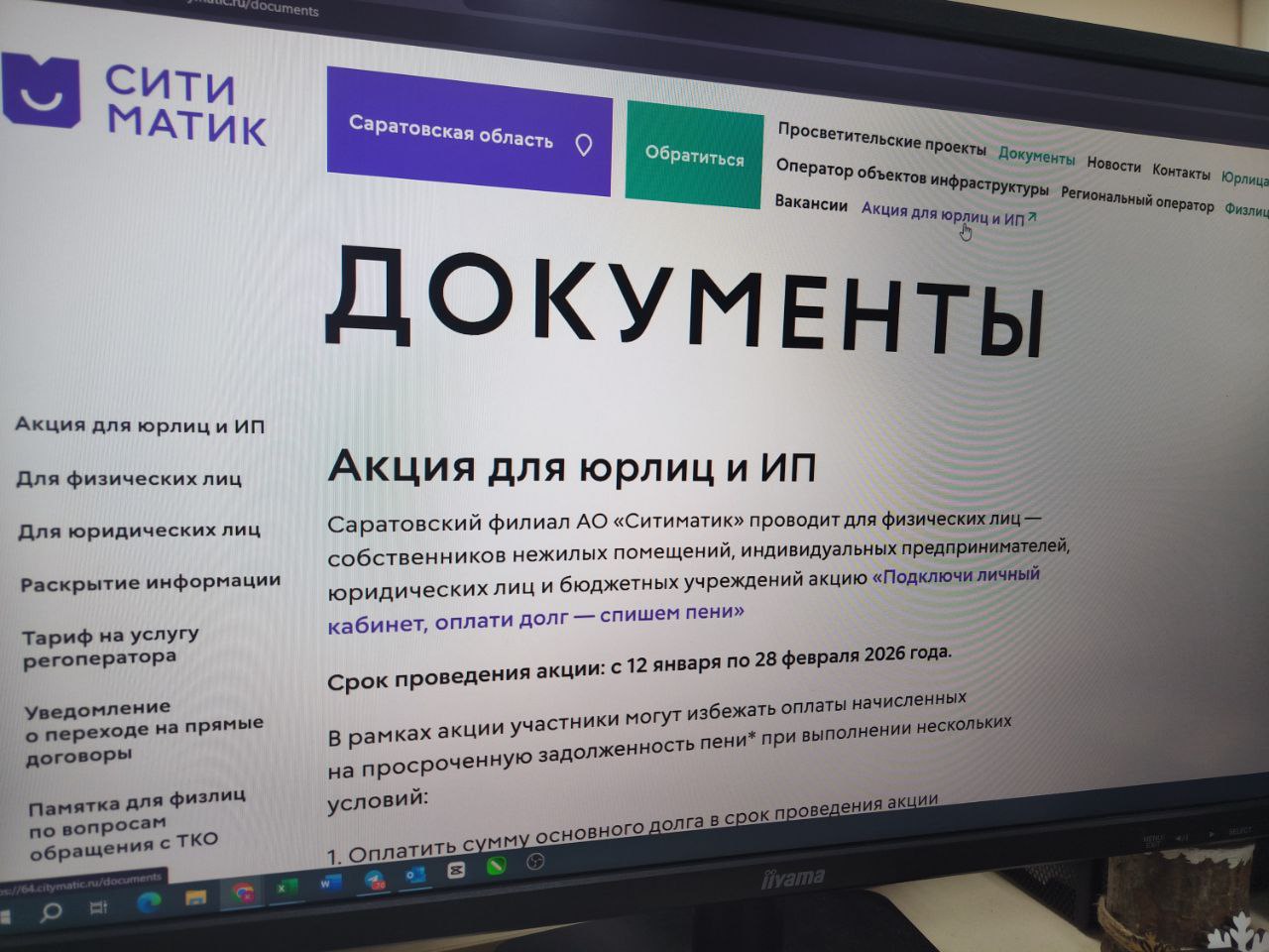 Акция продлится до 28 февраля. Остается несколько дней, чтобы принять в ней участие и избежать оплаты начисленных на просроченную задолженность за услугу по обращению с ТКО пени. Для этого необходимо выполнить два условия: оплатить сумму основного долга и зарегистрироваться в личном кабинете. Для физических лиц он находится по адресу: https://citymatic64.aisgorod.ru/, для юридических лиц – на сайте https://64.citymatic.ru/ в разделе «Юрлицам».