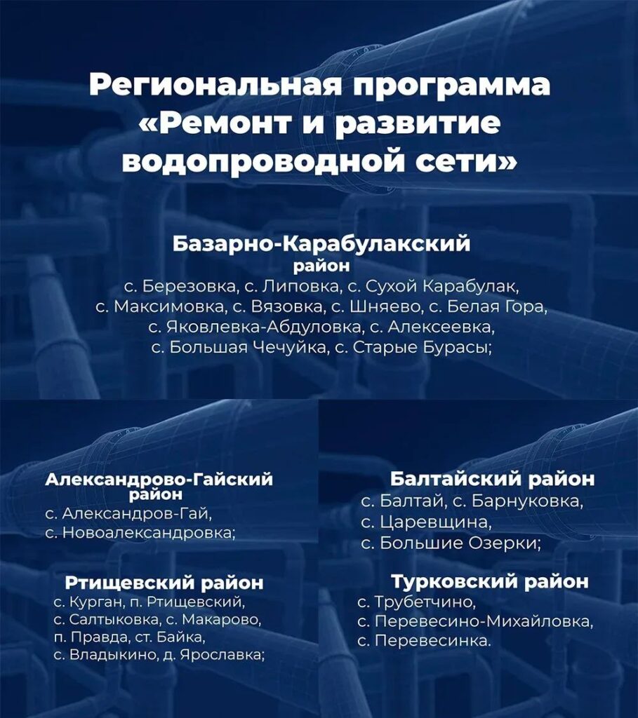 Ранее говорил о том, что 5 районов Саратовской области получат из регионального бюджета дополнительное финансирование на масштабный ремонт коммуникаций. 30 млн рублей будет распределено между следующими территориями: