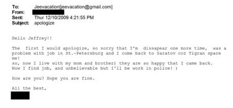 Как следует из документов, в переписке с мая по октябрь 2009 года девушка из Саратова обсуждала свои карьерные планы и выражала опасения потерять работу в модельном бизнесе. У неё возникли проблемы с оформлением документов в Санкт-Петербурге из-за регистрации в Саратове, и она планировала на две недели вернуться на родину для решения бюрократических вопросов. Однако, согласно последнему сообщению, она осталась там.