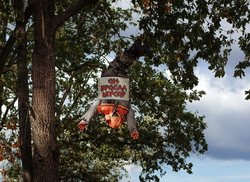 На опубликованном в соцсетях снимке запечатлен муляж человека, висящий на дереве. Фигура в куртке и перчатках сопровождается табличкой с пояснением: «Он бросал мусор».