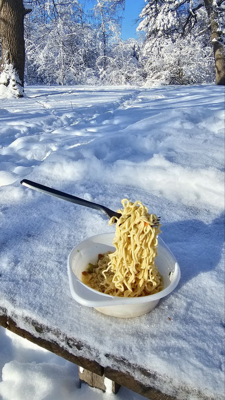 Для опыта свежезаваренную лапшу накручивают на вилку и выносят на мороз, поднимая конструкцию вверх. Уже через несколько секунд она превращается в ледяной монолит: лапша, контейнер и вилка смерзаются, создавая иллюзию парящей в воздухе вилки.