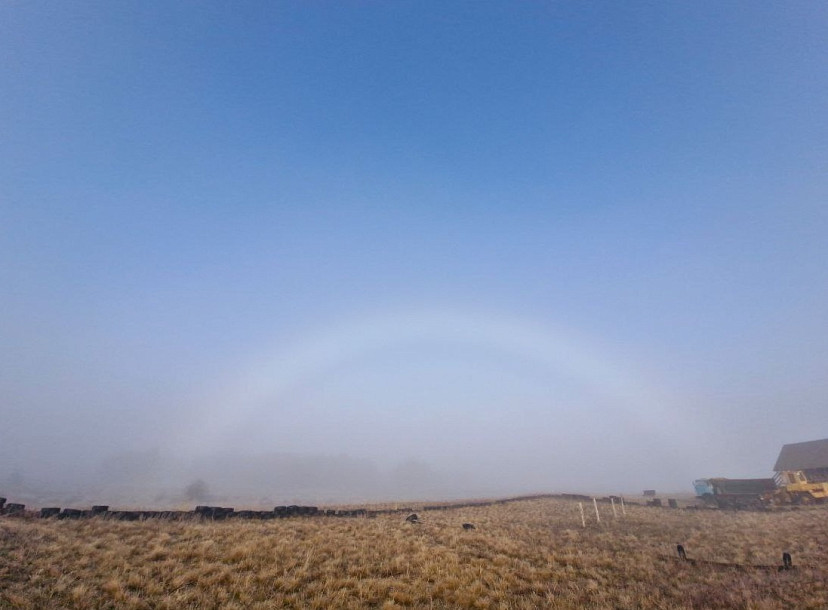 Как пояснил метеоролог Максим Червяков, это явление возникает в микроскопических каплях тумана. В отличие от обычной радуги, она не имеет ярких цветов и выглядит как белесая светящаяся дуга.