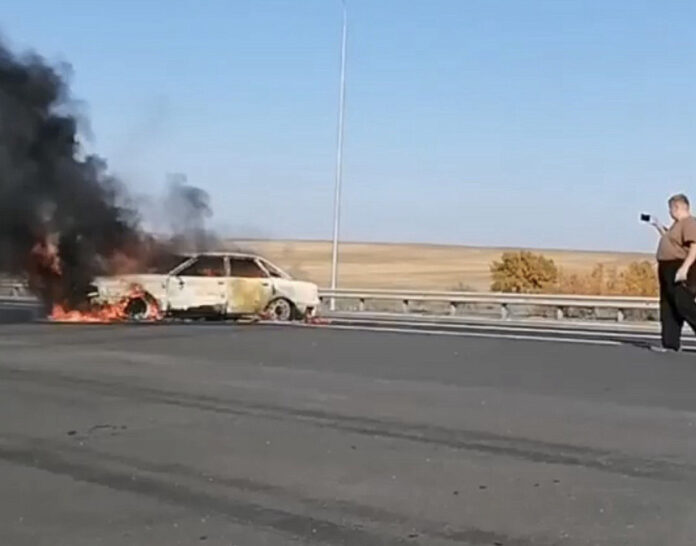 Инцидент случился на путепроводе в 14:52, где легковая машина была полностью охвачена огнем.