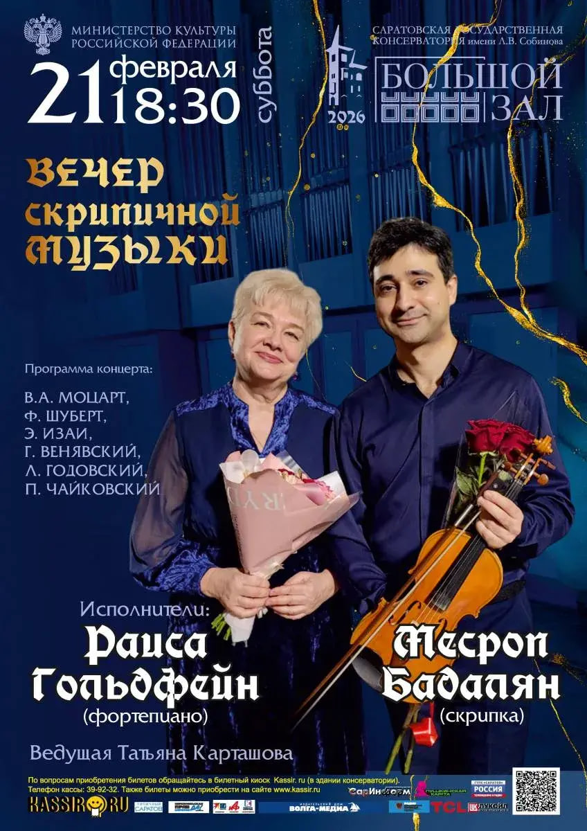 Для зрителей выступят лауреат международных конкурсов Месроп Бадалян (скрипка) и Раиса Гольдфейн (фортепиано). В программе вечера — произведения признанных классиков: Моцарта, Шуберта, Чайковского, а также сочинения Эжена Изаи, Генрика Венявского и Леопольда Годовского.