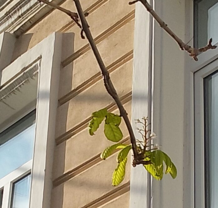 Проснувшийся каштан «поддержали» сирень, набившая почки, и трава, бурно пошедшая в рост во время потепления.