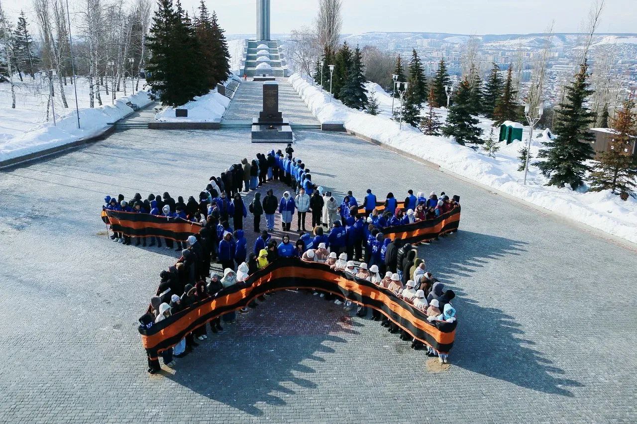 Участники акции выстроились в живую инсталляцию, образовав символическую фигуру звезды, после чего развернули 60-метровую Георгиевскую ленту — один из главных символов воинской славы и доблести русской армии. Масштабное полотно в руках молодежи стало олицетворением неразрывной связи поколений защитников Родины.