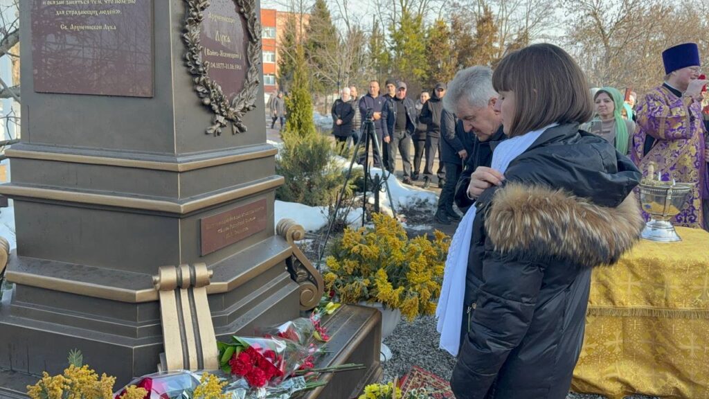 После Божественной литургии в Христорождественском храме поселка Романовка состоялось торжественное открытие и освящение памятника святителю Луке Крымскому (в миру — Валентину Феликсовичу Войно-Ясенецкому).
