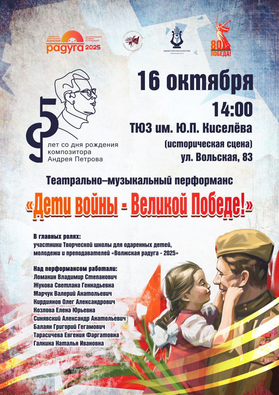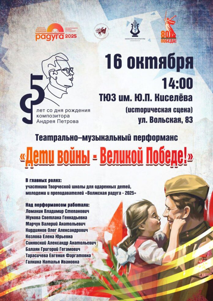 Кульминацией станет показ театрально-музыкального перформанса «Дети войны – Великой Победе» на сцене Саратовского ТЮЗа 16 октября. Постановка создана участниками региональной творческой школы «Волжская радуга» и посвящена 80-й годовщине Победы в Великой Отечественной войне.