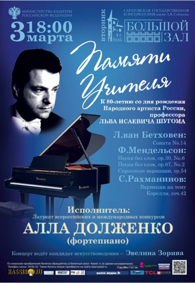 В Большом зале Саратовской государственной консерватории имени Л.В. Собинова пройдет вечер памяти, посвященный 80-летию со дня рождения выдающегося музыканта и педагога, Народного артиста России профессора Льва Шугома.