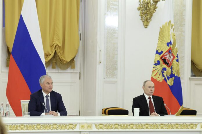 В заседании приняли участие председатель Государственной Думы Вячеслав Володин, руководители политических фракций ГД и депутаты.