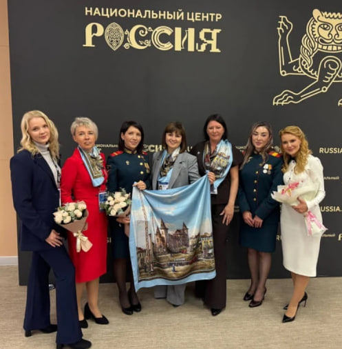 Саратовские делегаты вручили героине памятный дизайнерский платок с символикой региона как знак глубокого уважения и благодарности земляков.